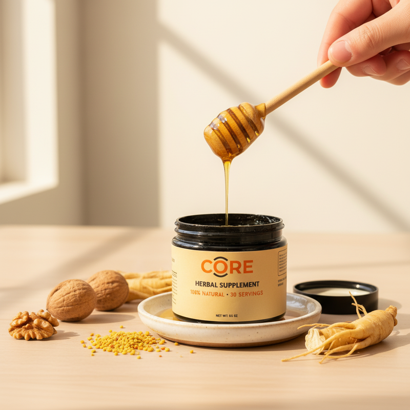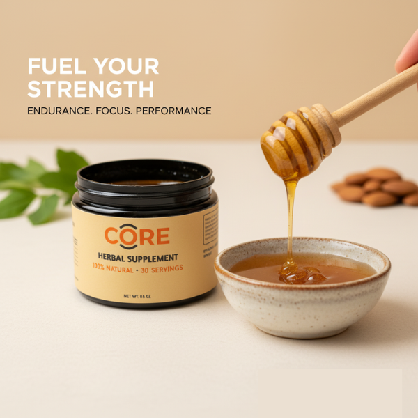 CORE is a premium herbal honey blend created to offer a simple, natural way to elevate your daily routine. Built around organic raw honey and carefully selected botanical extracts, CORE represents a clean, modern approach to traditional wellness—pure ingredients, real craftsmanship, and a focus on everyday balance. Smooth in texture and rich in natural flavor, it’s designed to be a versatile part of your lifestyle, whether enjoyed straight from the spoon or mixed into your favorite foods.